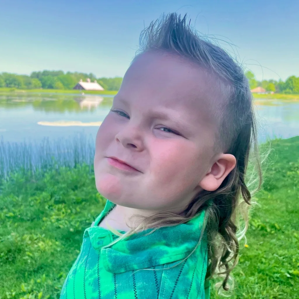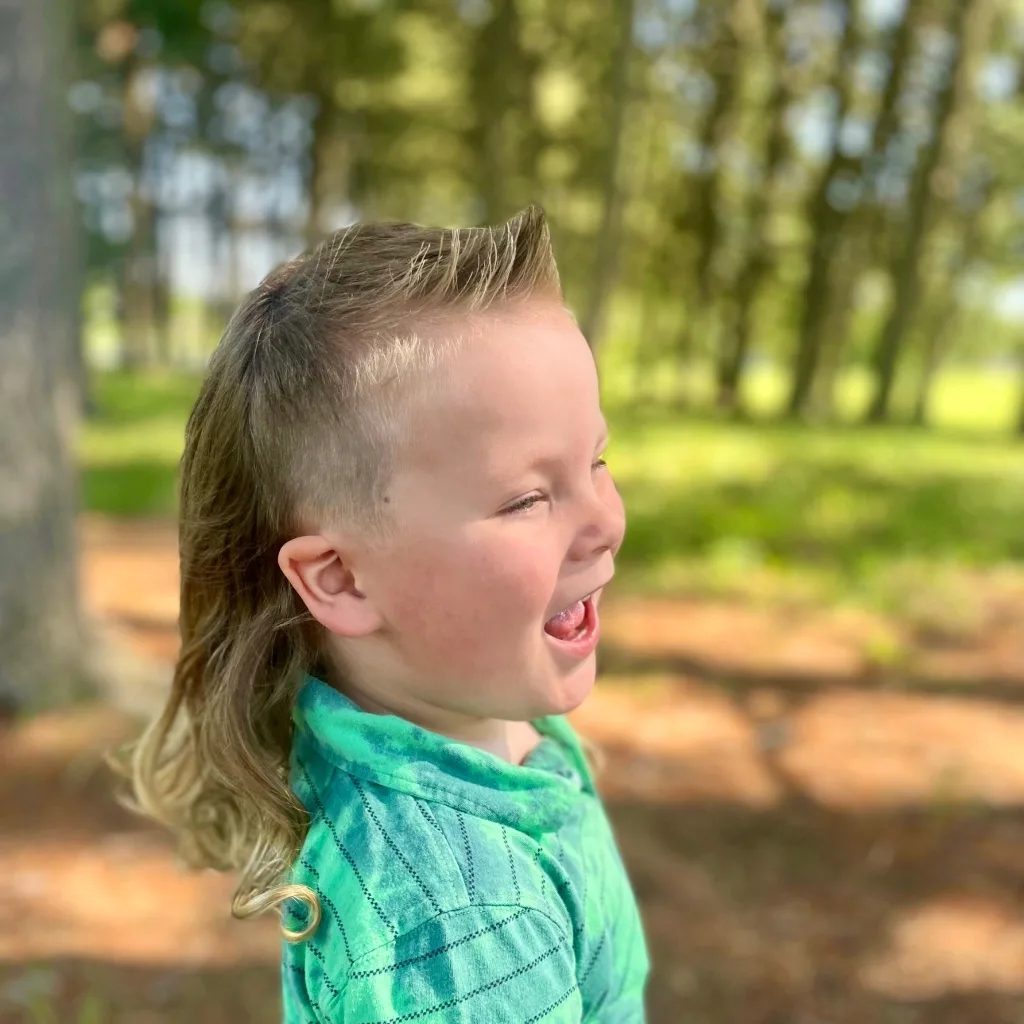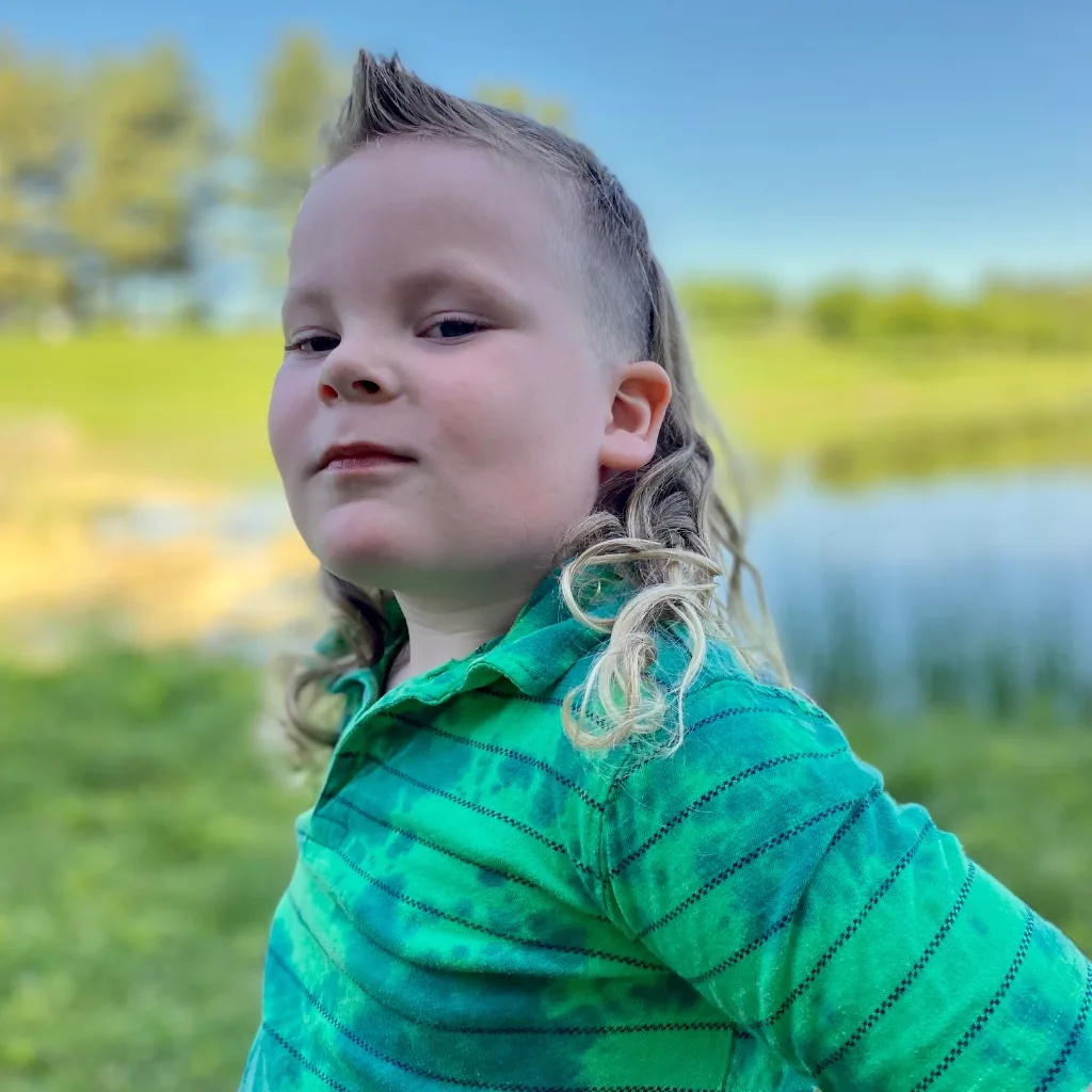 He calls it ‘The Duck’ — smooth up front, wild in the back, just like a muddy pond ready for jumping in. He wanted a haircut as wild as his personality. A country boy through and through, he loves monster trucks, dirt, and big hair. This mullet isn’t just a style, it’s a lifestyle!