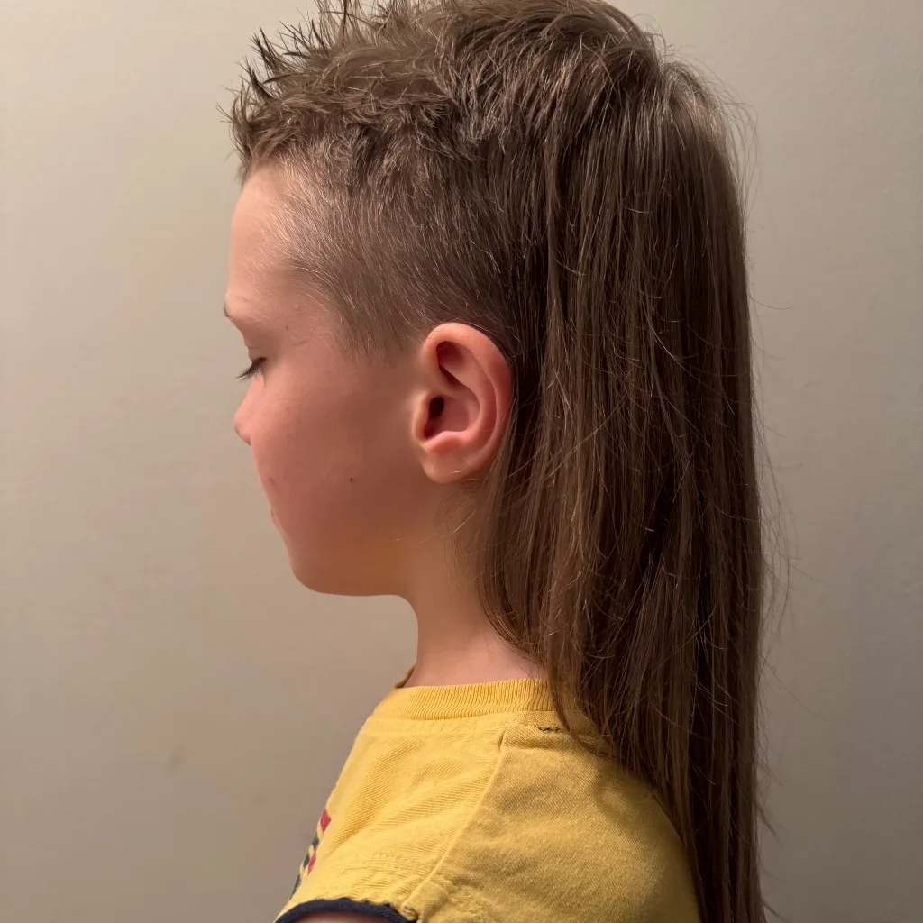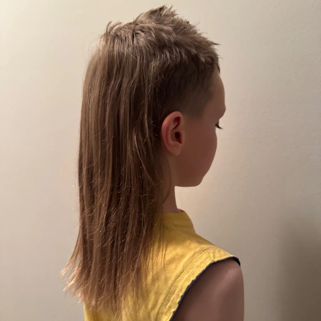 My name is Finnegan I am 6 years old and Ive been growing my majestic mullet for almost 3 yrs. My new favorite way of styling is spikey top and straight long back. My mullet fits my personality.