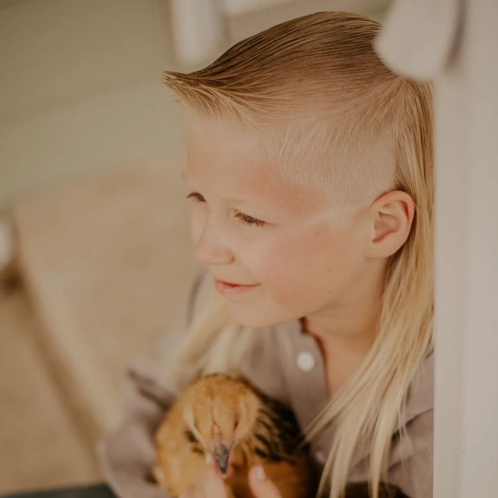Kutler was literally born with a mullet - a full head of white blonde hair that was short in the front and long in the back. While most babies lose their hair, his just kept growing right into a natural mullet. He’s had it since birth, and it quickly became his signature look. As a military kid who’s moved around a lot, Kutler’s mullet has been the one constant - it’s part of his identity and a piece of home he takes with him wherever he goes.
