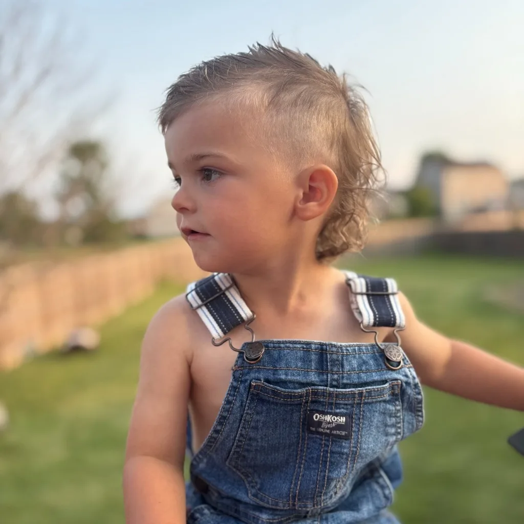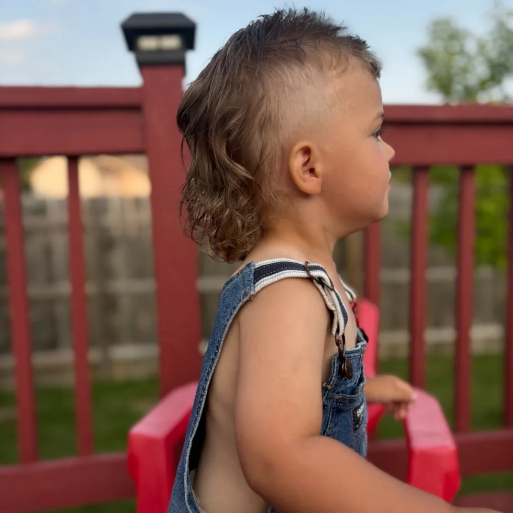Max came into the world with wild hair and an even wilder spirit. We never planned the mullet, but his curls took over early, and we just let the magic happen. Now at 21 months, he's a tiny tornado with big energy, rocking a mullet that's as loud as he is. He's wild, unpredictable, and full of joy. Whether he's covered in dirt or splashing in puddles, Max is chaos in motion with hair to match. Around here, we call him Full Throttle Max —because there’s no holding him back.