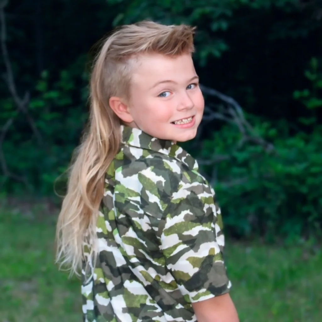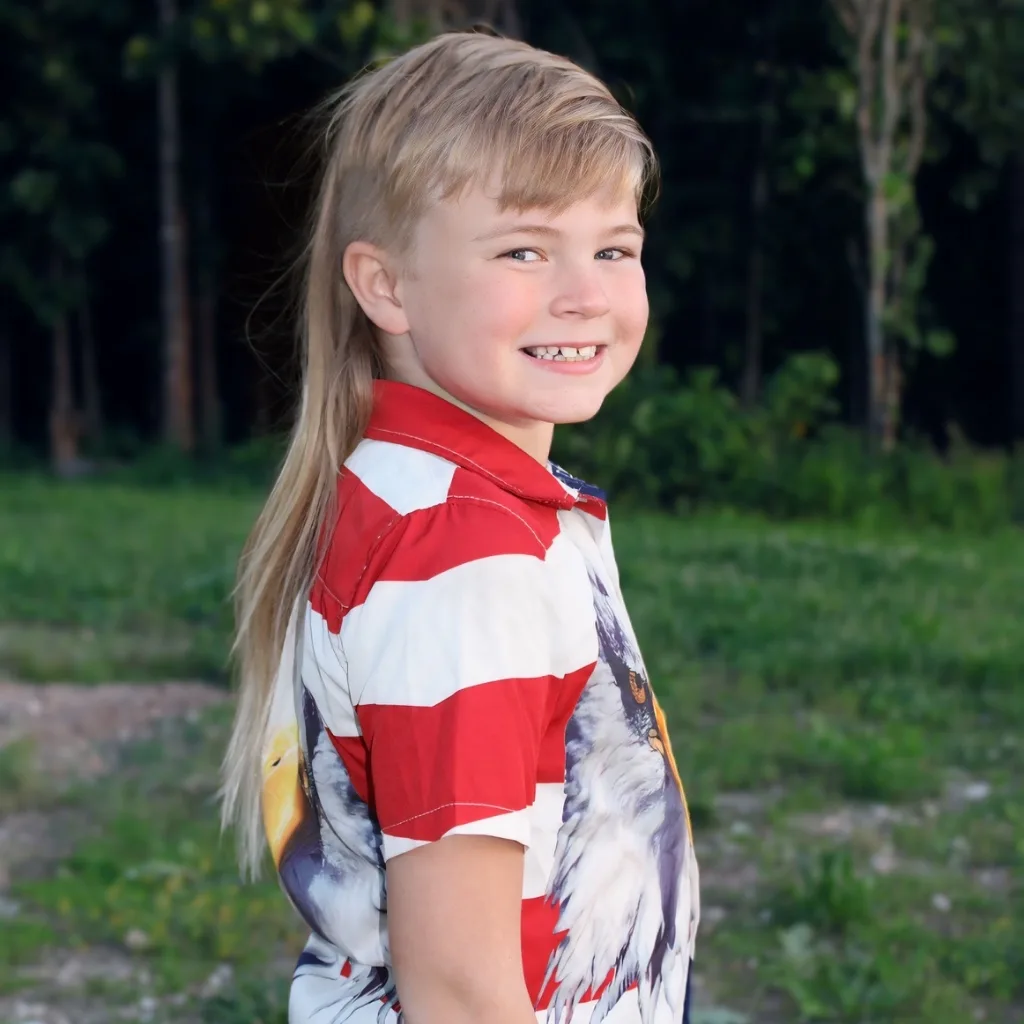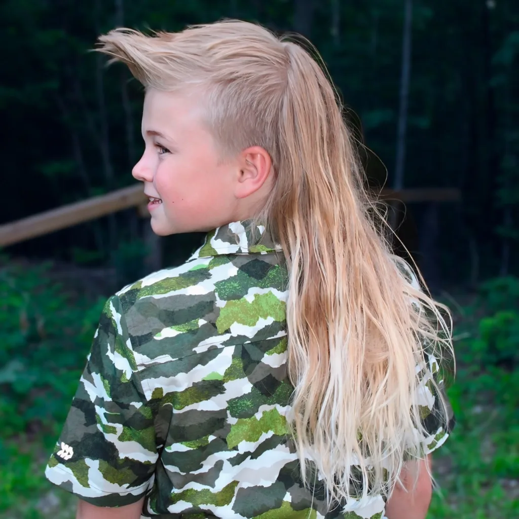 The “Mulletcorn” was born at age 3 from Oliver’s pure love of all things magical, especially Unicorns. He started spiking the front like a horn and let the mane start flowing. Now, over 5 years in the making, is a central part of his personality and style. His mullet is nearly as fierce as him; the son of a Veteran, obsessed with the outdoors, and animals.