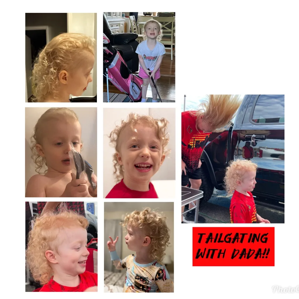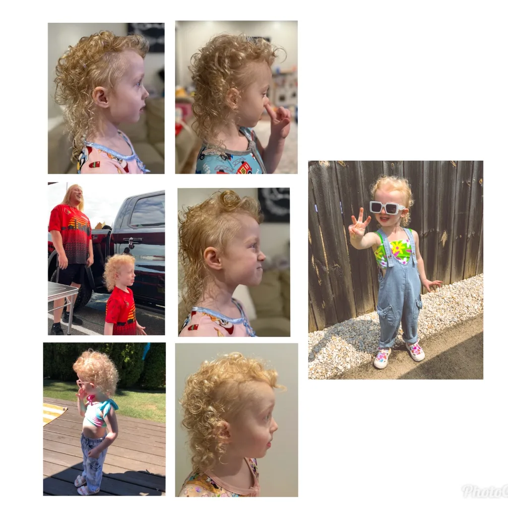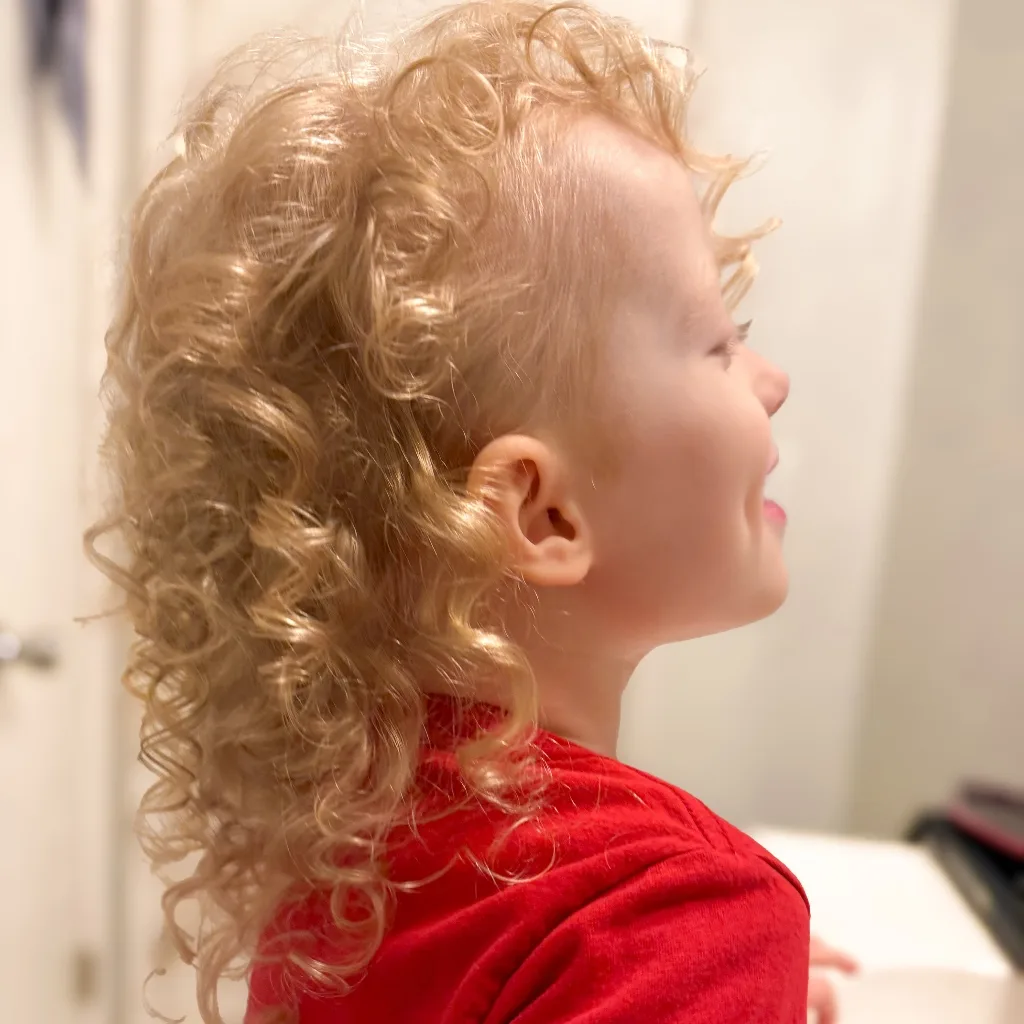 That Southend Sunshine Shag ain't no trim job; it's a blonde, curly waterfall a-pourin' down her little neck. Them ringlets are tighter than a banjo string, bouncin' and swayin' like a hound dog's tail on a porch swing. It's been growin' wild and free, soaked up that Kentucky sunshine, makin' it shine like spun gold. It’s a natural-born beauty, that there Sunshine Shag, a true homegrown Kentucky original!